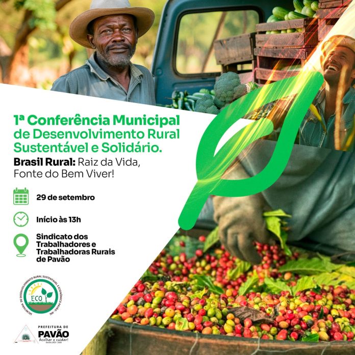 A Secretaria de Desenvolvimento Rural Sustentável e Econômico, por meio da Prefeitura Municipal de Pavão convida todos para participarem da 1ª Conferência Municipal de Desenvolvimento Rural Sustentável e Solidário.